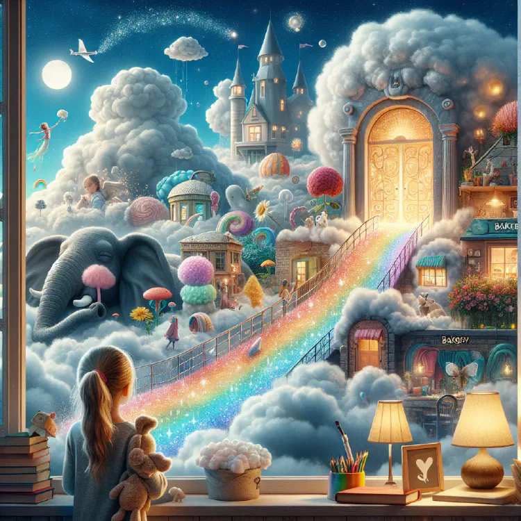 Together, they walked across the bridge, visiting the most wonderful clouds June had ever seen. There was the Cloud Bakery, where a jolly sheep with flour-dusted wool baked cookies that tasted like different kinds of laughter—giggles, chuckles, and the occasional snort.