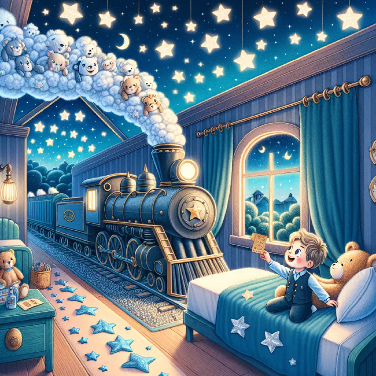 The train pulled into a station made entirely of fluffy white clouds. Creatures of all kinds climbed aboard—a yawning lion cub, three sleepy rabbits in nightcaps, a drowsy dragon clutching a stuffed unicorn.