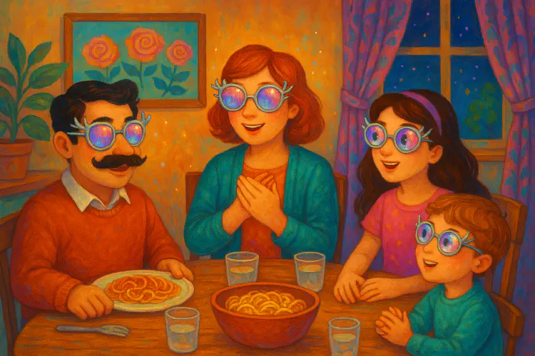 They each put on a pair of glasses, and immediately something strange happened. When Papa opened his mouth to speak, no sound came out! He tried again. Nothing! He looked puzzled, then remembered—he had to listen first.
