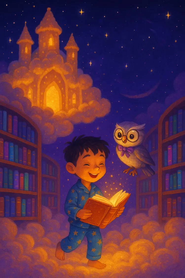 Every evening at exactly seven o’clock, when the sky turned the color of purple plums, something magical happened above Kai’s town. A library made entirely of shimmering golden clouds floated down from the stars.