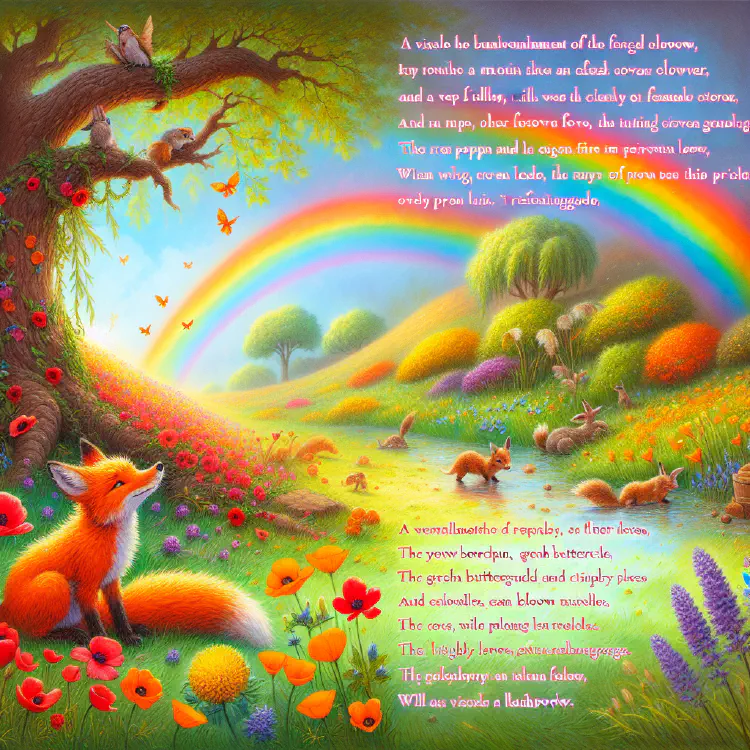 So off he trotted, following the rainbow’s colorful arch across the meadow. His paws left little prints in the dewy grass as he ran and jumped, never taking his eyes off those beautiful colors in the sky.