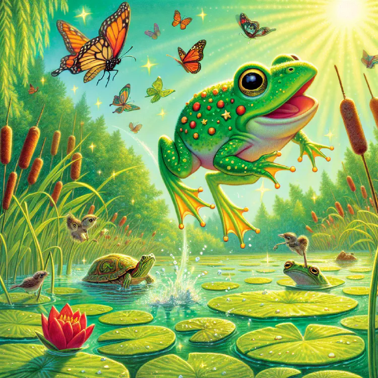 In a sunny pond at the edge of Willowbrook Woods, there lived a little green frog named Zoe. She had the biggest, brightest eyes you ever did see, and spots on her back that looked like tiny golden stars.