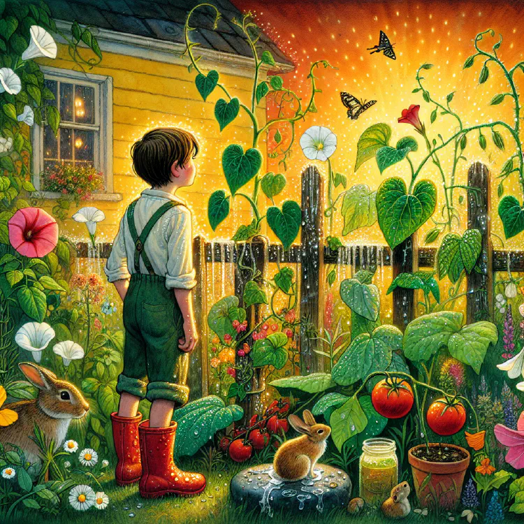 Charlie discovers his garden glowing with raindrops after a storm, where talking animals teach him that gratitude and wonder create inner light.