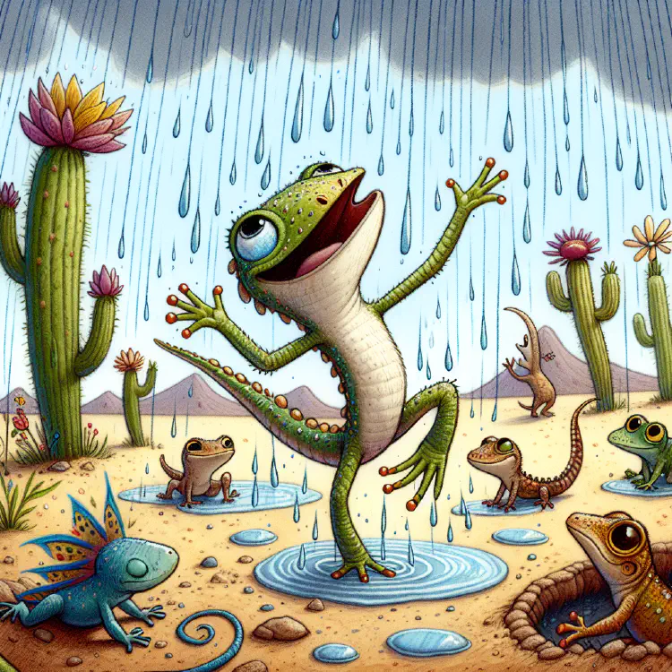 As the first droplets began to fall, Pearl started to dance. She twirled and leaped, her laughter echoing across the desert. The other lizards watched in amazement from their hiding spots.