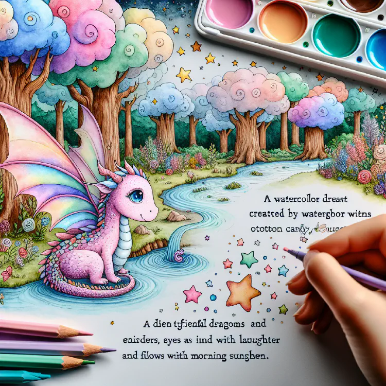 She painted a friendly dragon with scales that looked like butterfly wings and eyes as gentle as morning sunshine. She added a forest where the trees grew cotton candy clouds instead of leaves, and a river that flowed with liquid laughter—ripples that giggled as they rolled along.