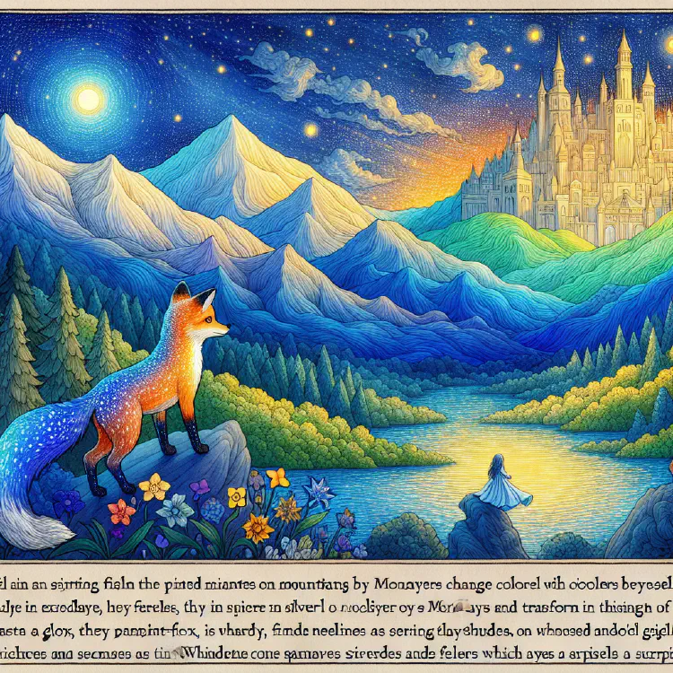 High above the clouds, where the sky turns seven shades of purple at sunset, stood the Painted Mountains. They weren’t called painted because someone had colored them—oh no! They were painted because they changed colors all by themselves. On Mondays, they sparkled gold. On Tuesdays, they shimmered silver. And on Wednesdays… well, Wednesdays were always a surprise.