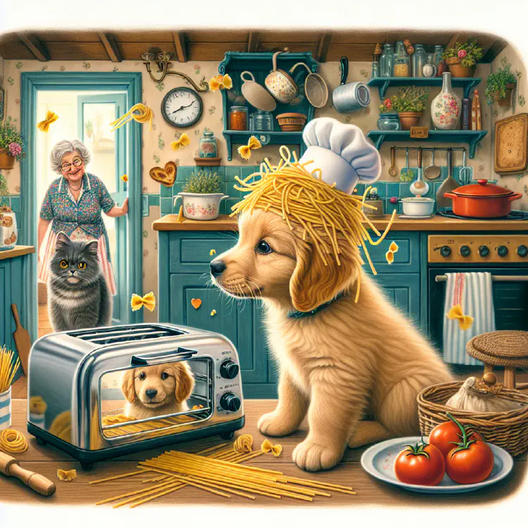 Emmett grabbed the bag of pasta with his teeth and gave it a mighty shake. Noodles flew everywhere—into the sink, onto the counter, and three pieces landed perfectly on his head like a fancy hat.