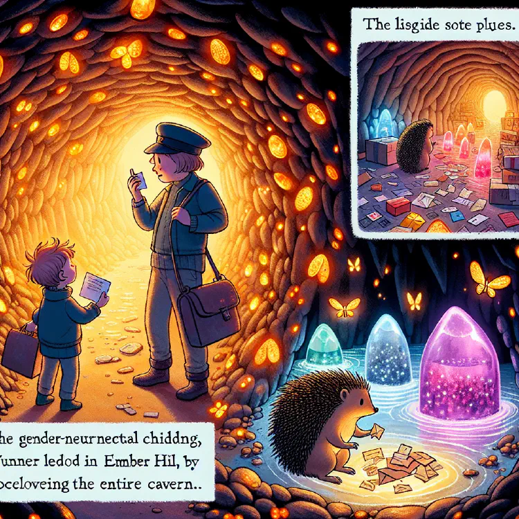 “Found them? Oh, wonderful! I’m Pipkin, the Tunnel Postmaster,” said the hedgehog, tipping his cap. “These tunnels connect to every special place in Ember Hill—the roots of the oldest oak tree, the chimney of the bakery, even the bell tower at school! We deliver dreams, lost giggles, and forgotten songs to wherever they’re needed most.”