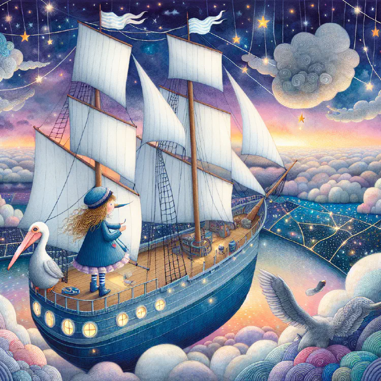 The ship’s sails filled with wind that smelled like cinnamon and stardust. Up, up, up they sailed, past where airplanes flew, past where birds could fly, past where clouds grew tired and took their naps.