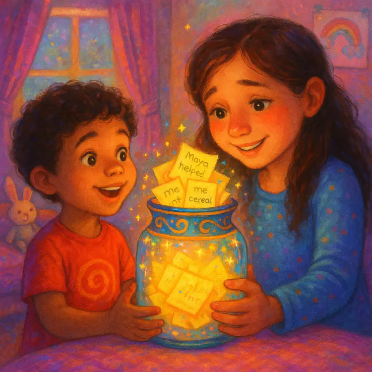 That very evening, Isaac’s big sister Maya helped him reach the cereal on the top shelf—even though she was busy building a block tower. Isaac found his special thank-you notebook (the one with the rocket ships on the cover) and carefully wrote: Maya helped me get cereal. He folded the paper into a tiny square and dropped it into the jar with a satisfying plink!
