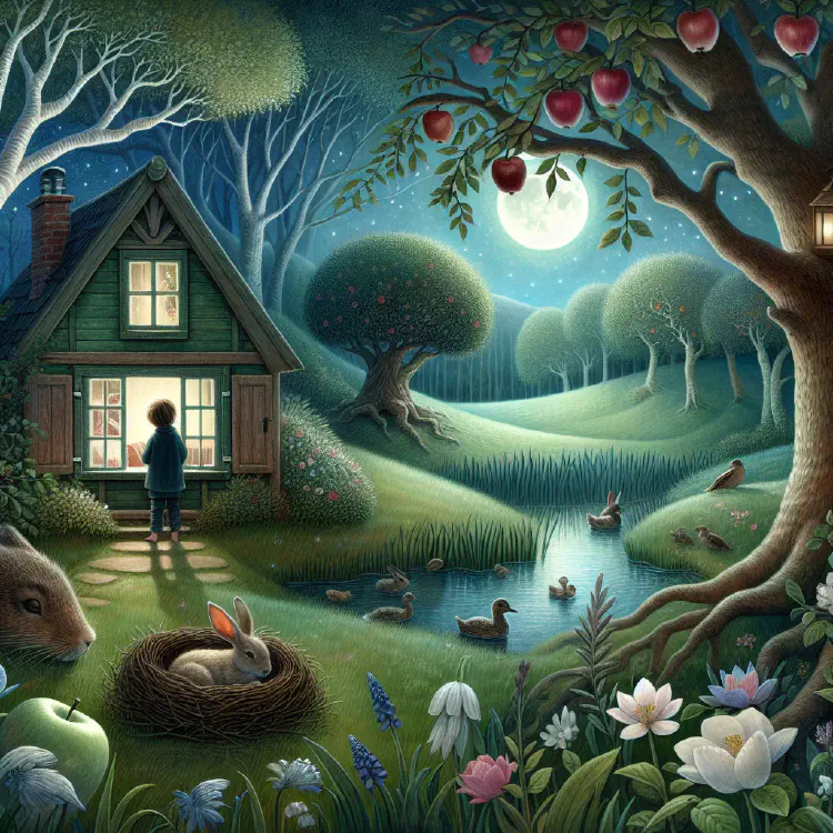 As the Wind sang, Jack watched through his window as the whole world seemed to sway and settle down for sleep. The tall grass in the meadow bowed and swished. The apple tree branches nodded slowly. Even the flowers seemed to close their petals, tucking themselves in like tiny children pulling up blankets.
