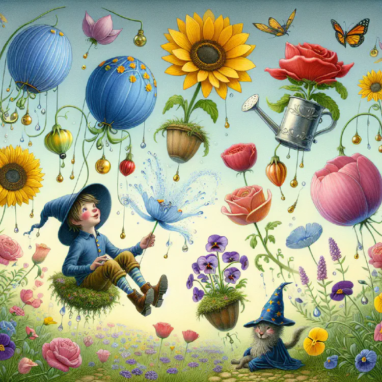 The wizard handed him a watering can that was as light as a feather. “First, we water the flowers. But remember—they’re upside down now that they’re floating, so we water from below!”
