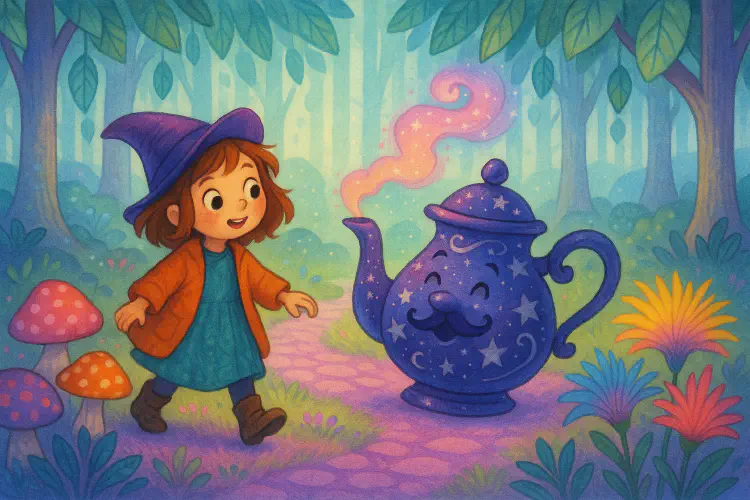 “Welcome to the Shimmer Woods,” announced the teapot. “First stop on our journey! Keep your eyes open for Singing Mushrooms—they’re quite friendly once you compliment their caps.”
